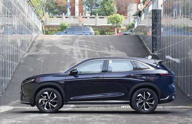 我们首先来看新车的外观设计方面,车头造型采用X型金属中网与贯穿式灯带组合,灯组延伸至轮眉轮廓线形成视觉延伸,香槟色下护板与黑色格栅的撞色设计强化层次感。大灯组集成LED日行灯、自动开闭及延时关闭功能,灯腔内部采用矩阵式排列,夜间点亮后与中网镀铬饰条形成光幕效果。前保险杠两侧设置导流槽,配合底部银色护板,既降低风阻系数又提升运动属性。机盖隆起的两道筋线向中网汇聚,配合凯翼飞翼LOGO,营造出俯冲式姿态。这种设计语言在保留燃油车力量感的同时,通过灯带元素与隐藏式门把手的搭配,实现了传统与潮流的平衡。
