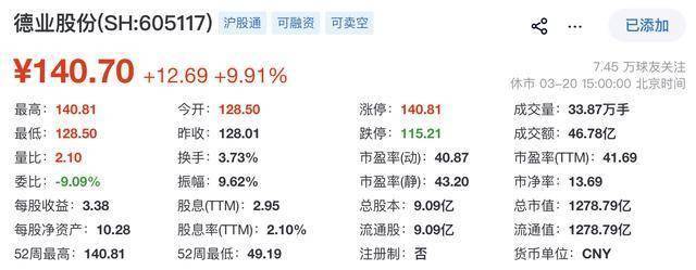 截至发稿时,德业股份A股股价报140.7元,总市值约1278.79亿元。